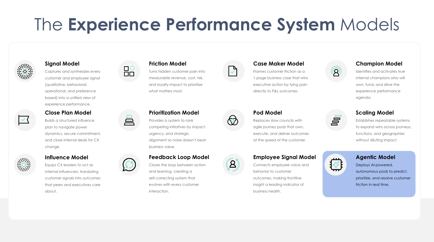 Each model solves a specific failure of traditional CX, and together they create a closed loop that connects customer signals to business outcomes.
